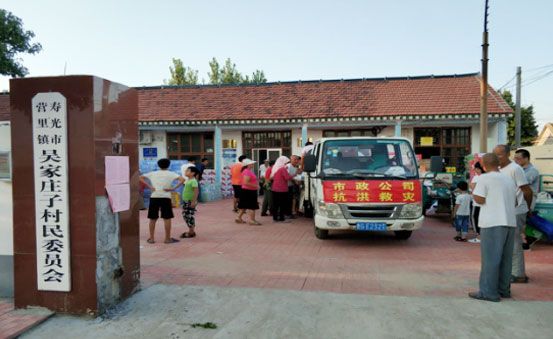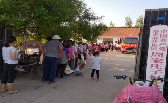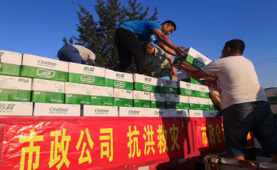 2018年8月25日,由公司董事長、總經理王曉軍帶隊,將738箱礦泉水、7950斤掛面和114箱方便面等價值48906元的應急救災生活物資送到受災嚴重的營里鎮周家村和吳家村賑濟災民。