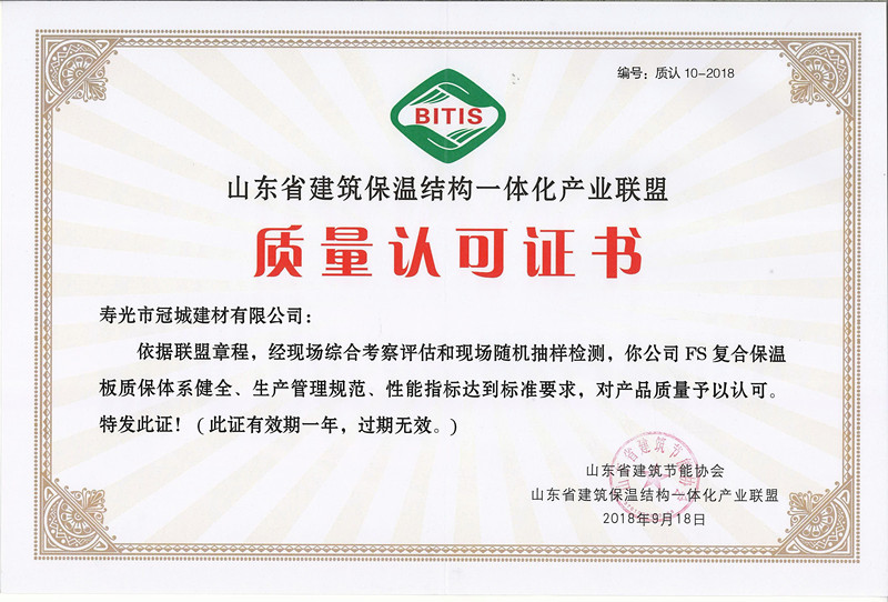 山東省建筑保溫結構一體化產業聯盟質量認可證書