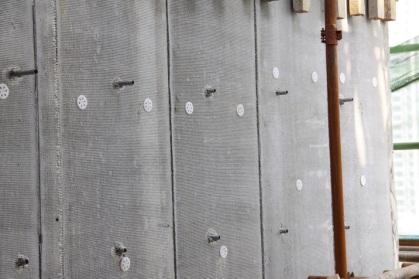 用扎絲將鋼筋與保溫板預(yù)埋件連接,墻內(nèi)部使用常用水泥支撐,支撐住FS保溫模板和外墻內(nèi)模板。