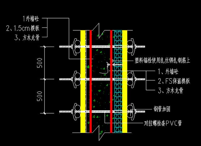 2、工藝原理:將成品保溫板作為主體施工砼外墻模板,通過特制鉚釘埋件,利用砼自身特性,澆筑砼后,將外墻保溫板與主體砼連接成整體,將外墻裝修階段保溫施工提前至主體施工階段施工。