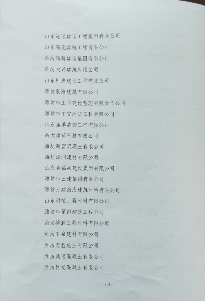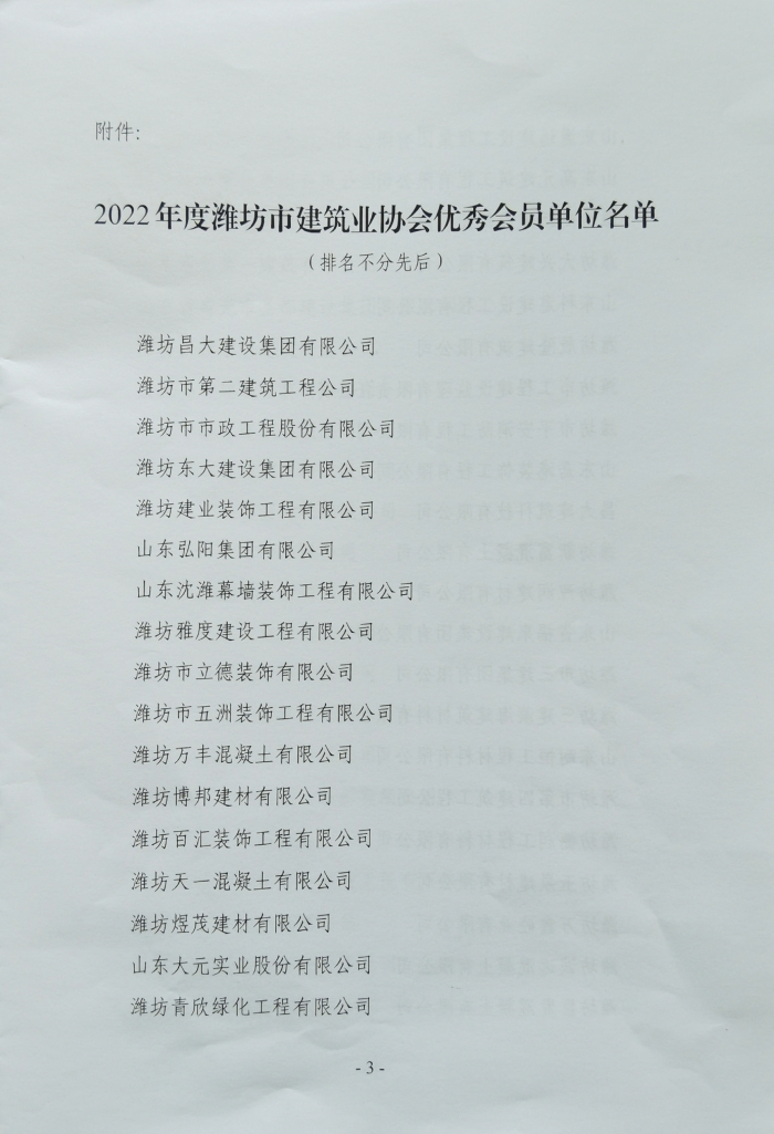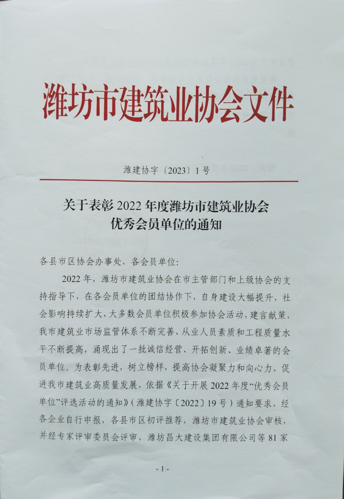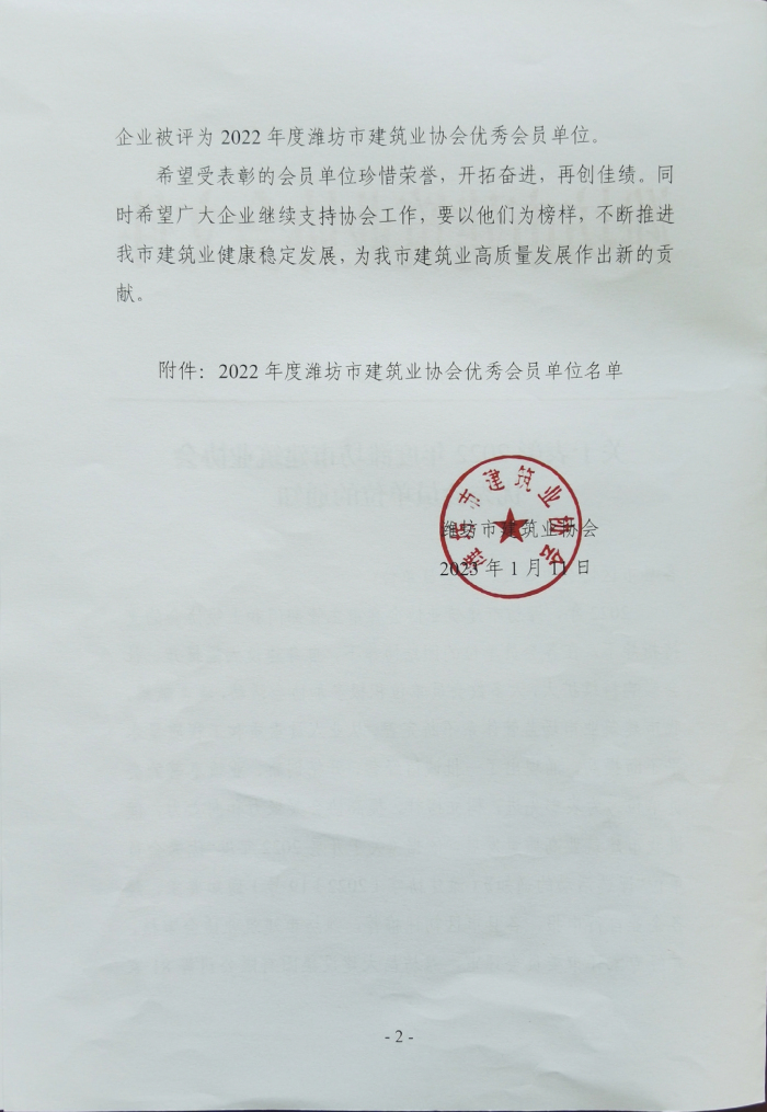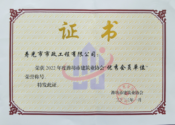 近日,濰坊市建筑業協會下發文件,公布了2022年度濰坊市建筑業協會優 秀會員單位名單,我單位位列其中。此榮譽的獲得,充分體現了公司在我市建筑業的綜合競爭優勢,彰顯了行業地位,是對公司從業人員素質、工程質量和企業管理水平等工作的肯定和認可。